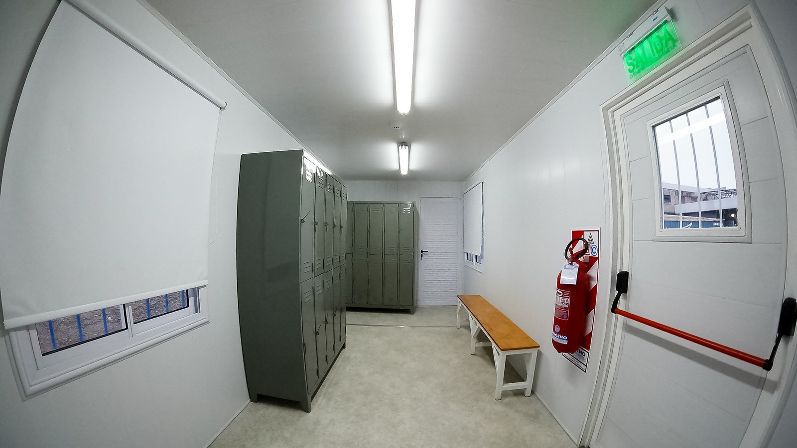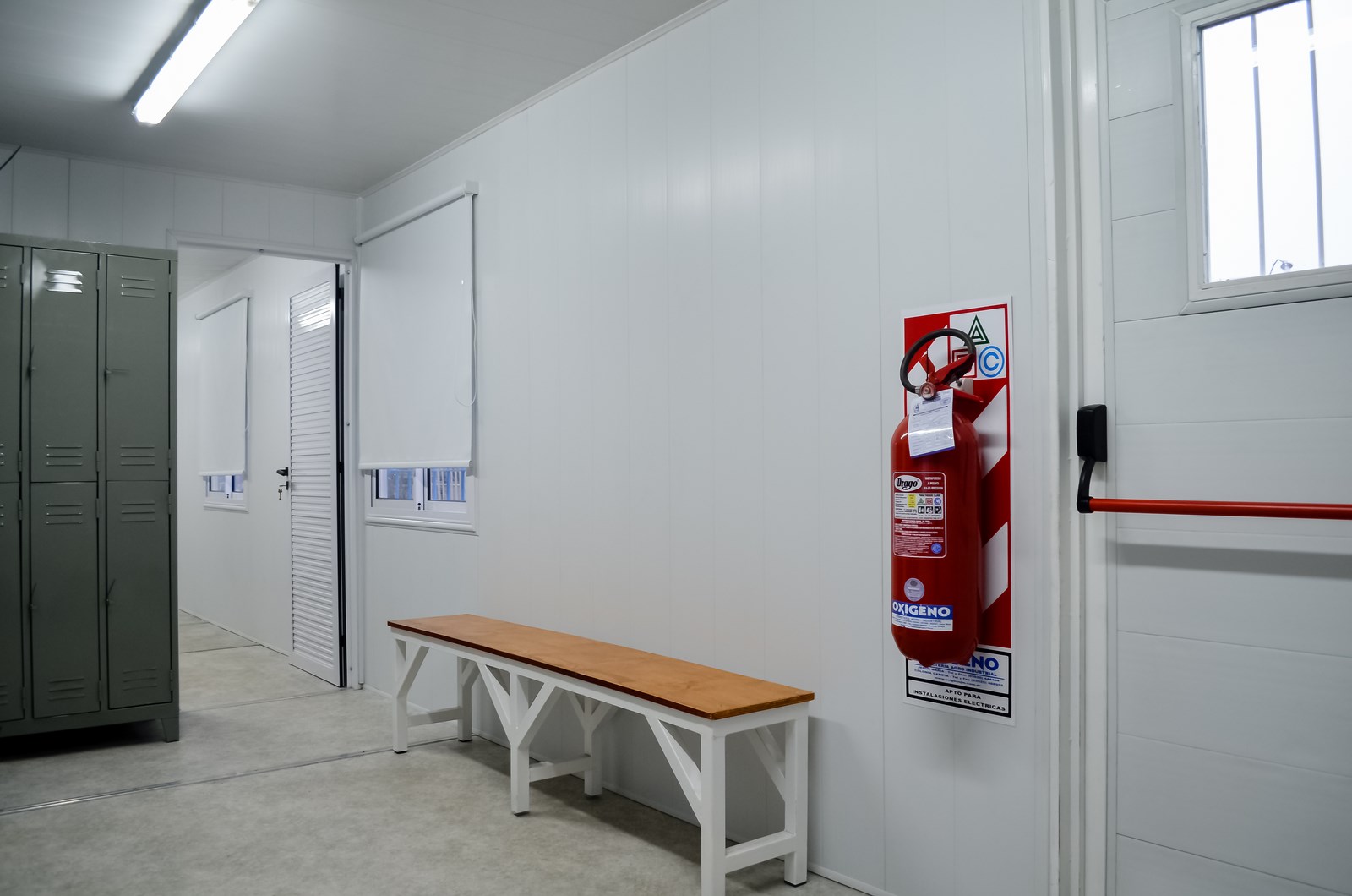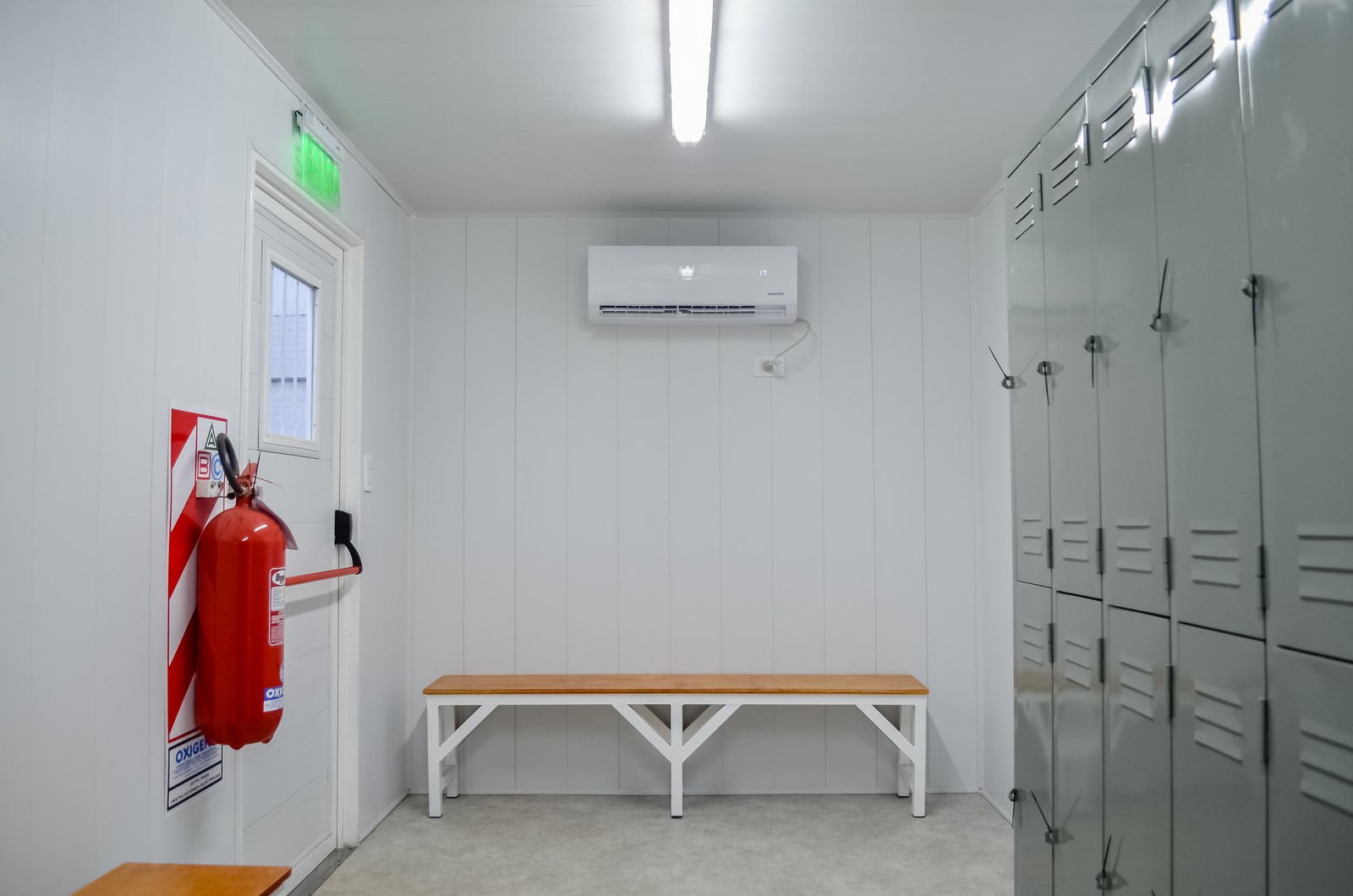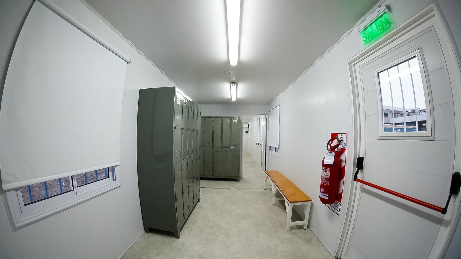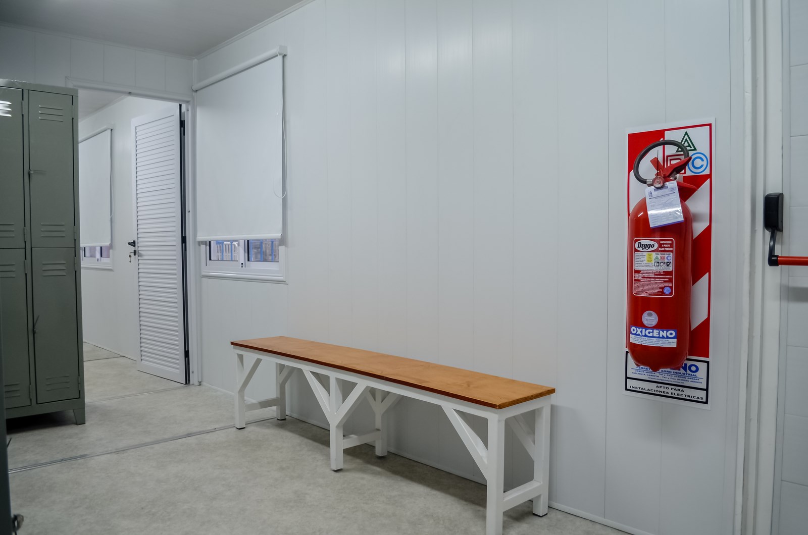 Las unidades habitacionales cuentan con un sector de vestuario con mobiliario totalmente incorporado, como bakers metálicos, bancas estructurales construidas con material de alta resistencia, cortinas roller blackout, y elementos de seguridad. En un segundo sector se desarrolló un espacio para boxes de duchas y elementos sanitarios.